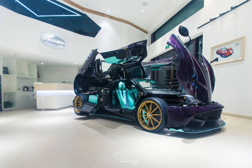 This is a Pagani Huayra Dinastia – a special Huayra wrapped in purple carbon fiber. It is one of 3 unique examples planned making it an extremely rare breed.