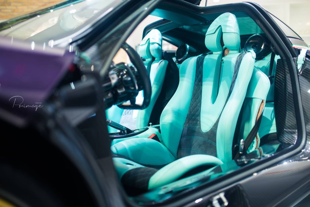 It features a exposed carbon fiber bodywork with a purple lacquer and turquoise accents. The interior is finished in the same turquoise shade. The seats are wrapped in a dual-tone black on turquoise along with the dashboard which is mostly exposed carbon fiber and machined metal.
