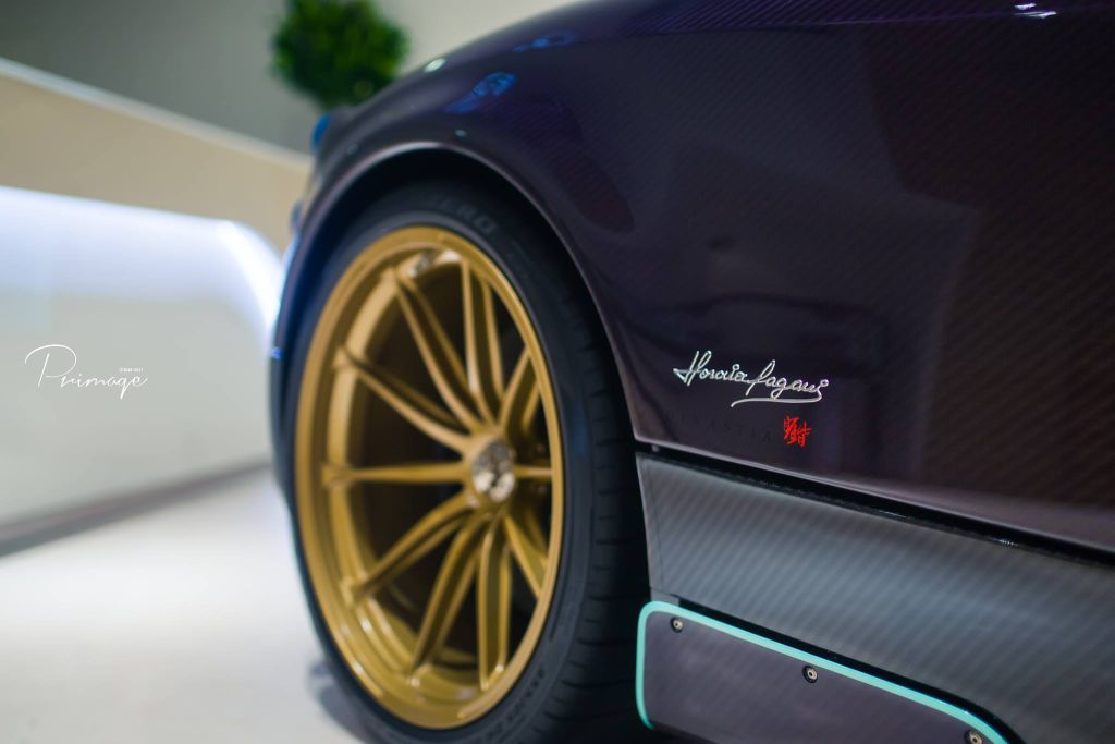 The 6.0-liter twin-turbo V12 engine by Mercedes-AMG produces 730 hp and drives the rear wheels. Special 10-spoke gold rims have been fitted on this particular Huayra Dinastia which perfectly compliment the purple exterior.