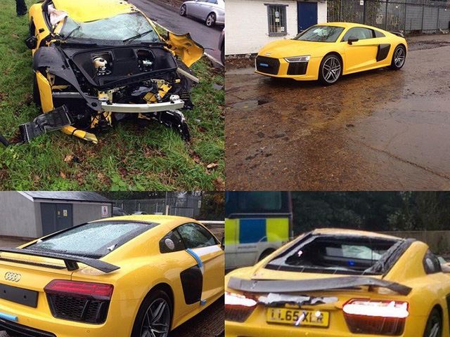 The new Audi R8 V10 Plus finished in yellow was being driven by a prospective customer on typical British wet day. The roads were slippery and the power of the new R8 V10 was perhaps a little too much for the driver to handle. The expensive supercar hit a curb and flipped over. This resulted in extensive damage to the roof and the engine bay. The front end was completely destroyed in the crash.