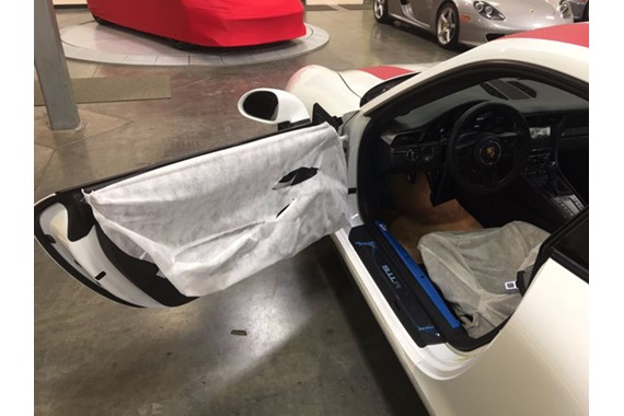 It’s one of the more common specs we’ve seen on a Porsche 911R. It has red stripes on a white base coat. The interior is wrapped in black leather. It does have the classic style bucket seats that are unique to the 911R. The cabin is lined with carbon fiber trim for added sportiness. Notice how the factory plastic and seat covers are still in place.