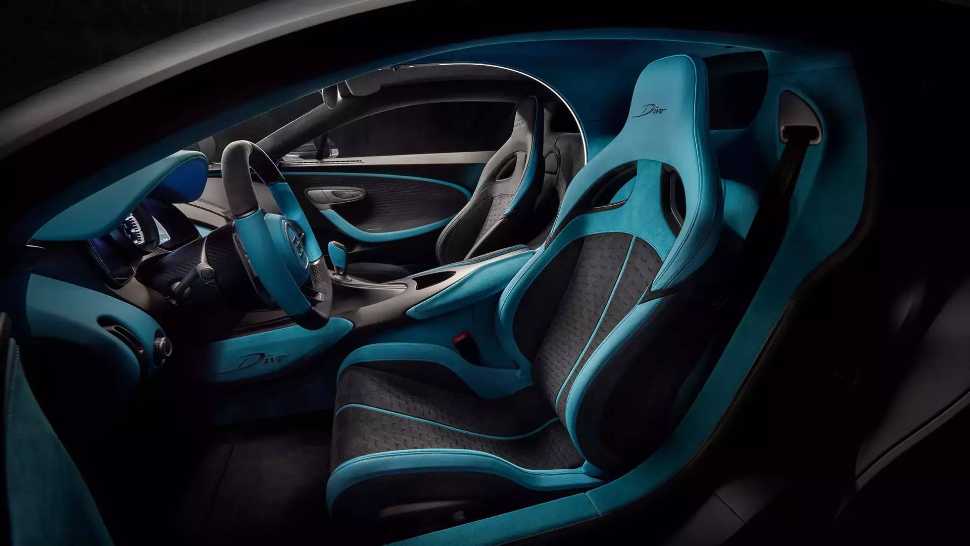 The interior of the Divo is similar to the Chiron and features 2-tone Alcanatara upholstery. The same 3-spoke steering wheel has been carried over along with the instrument cluster.