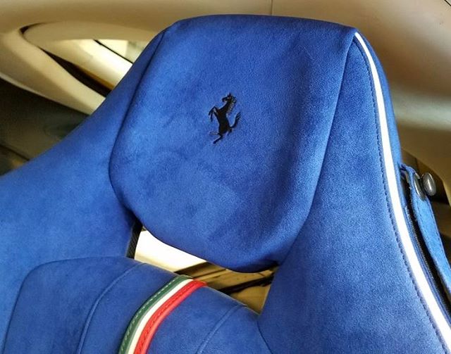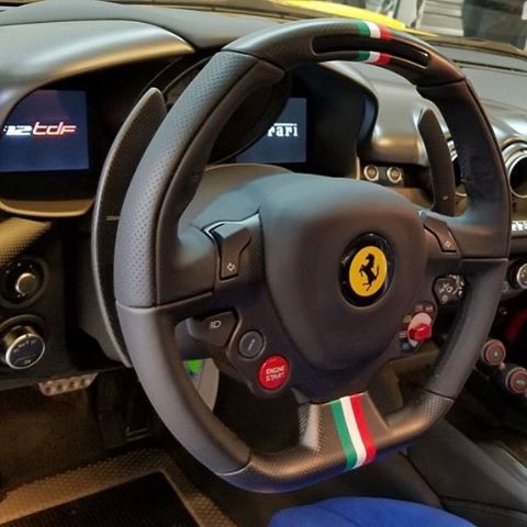 The F12tdf DSKL is painted in yellow with the Italian tricolore on top. It matches the color scheme of the iconic 250 Lusso Competizione. Even the rims match that of the classic wire mesh rims from the 1960s. The interior is finished in bare carbon and blue alcantara. Another unique touch is the tricolore on the steering wheel.