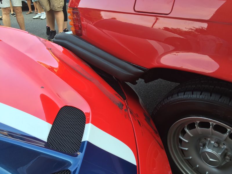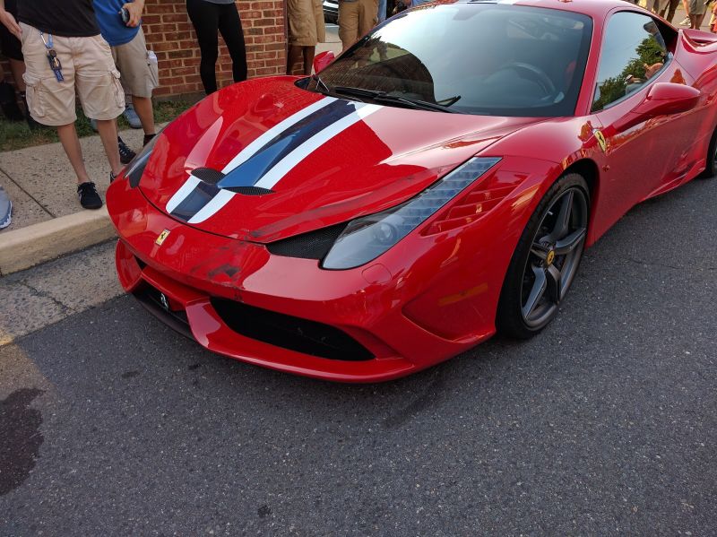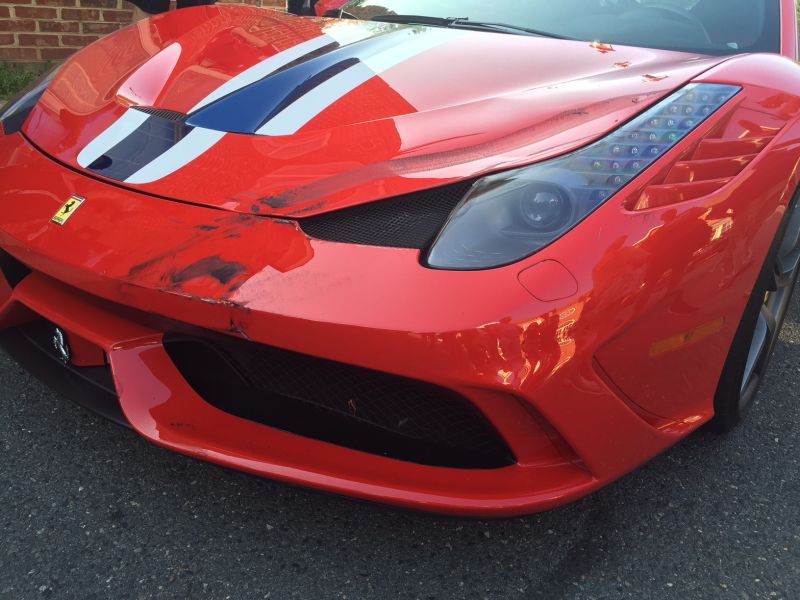 A Ferrari 458 Speciale parked at Katie’s Cars and Coffee in Virginia was hit by a classic Mercedes on Saturday. It looks like a lady driving the Mercedes 380 SL was trying to parallel park when she backed up into the $300,000 Ferrari.