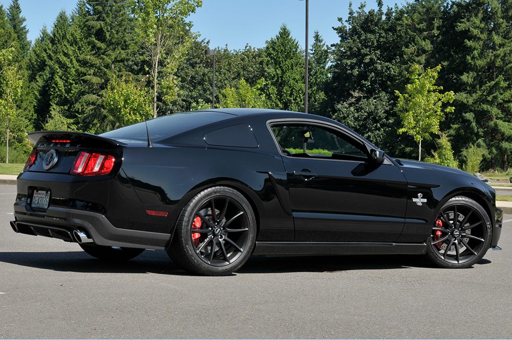 942 horsepower going through the rear wheels of Mustang that is street legal? Of course, it does come with numerous modifications to the suspension and chassis. The engine is a supercharged V-8 wrapped in an all-black Super Snake body. Shelby engineers have personally toiled over the car, fine tuning the engine to produce monumental levels of performance and make it manageable at the same time. High performance sports springs from Eibach replace the standard shock absorbers. Wheels and tires have also been upgraded. The Shelby GT500 Super Snake rides on gloss black wheels shod with Michelin SS rubber. The exterior modifications include carbon bits in the front and rear, power dome on the hood and hood pins to contain the monster that lurks beneath.