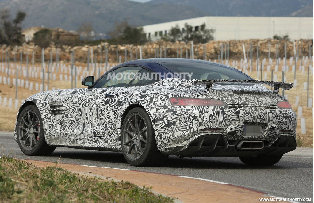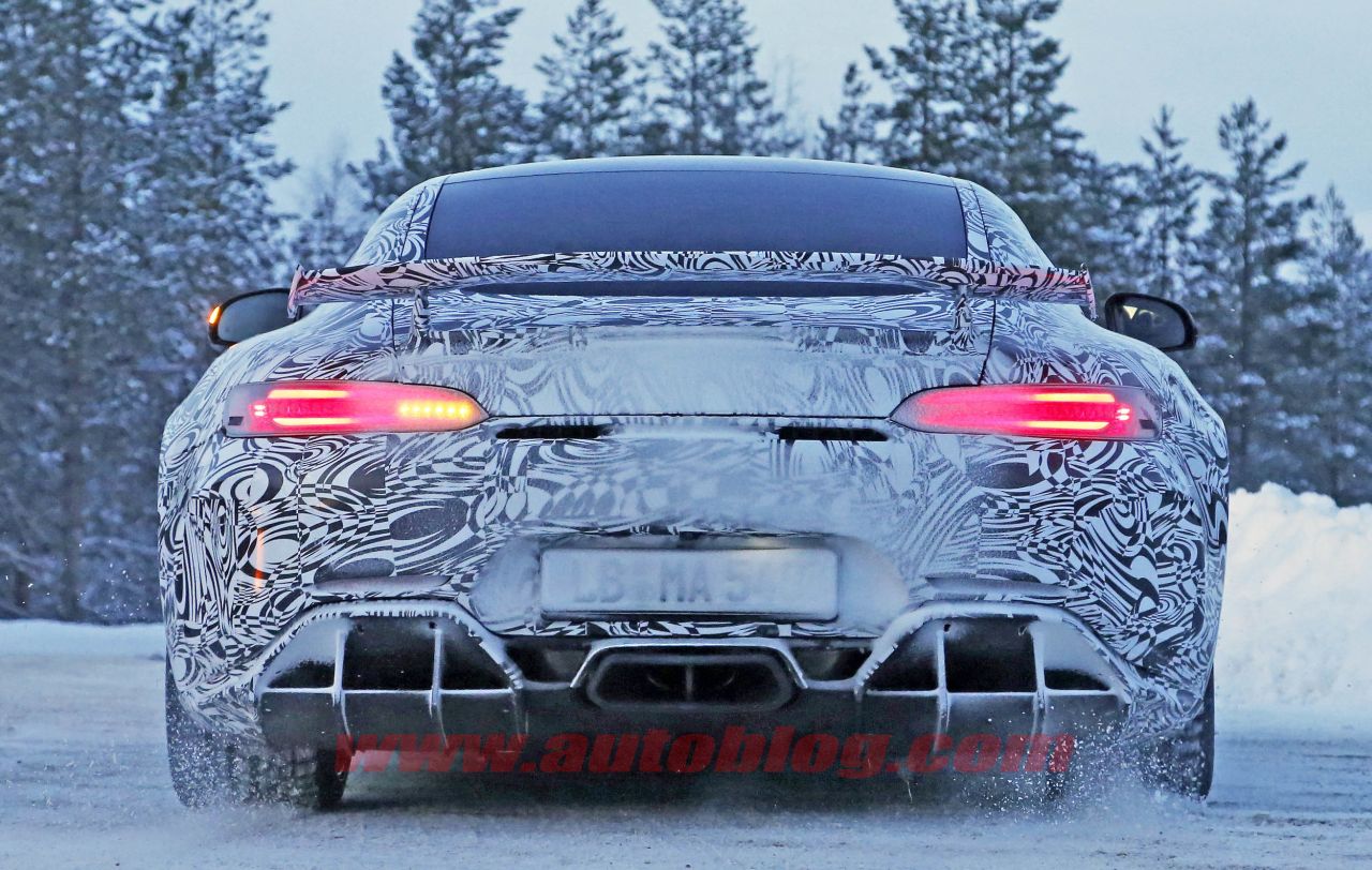 So, here are some more images of the upcoming hardcore Mercedes-AMG GT R this time with a bit less camouflage. Some of the key features to be noted are the large air intakes up front, a substantial diffuser with center-mounted exhausts. The active rear wing has also been replaced with a extra-large fixed spoiler.