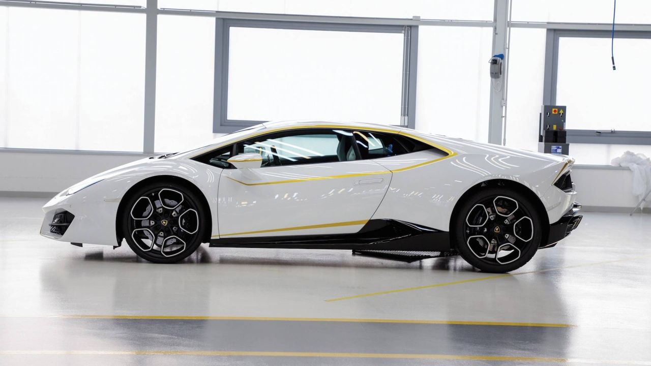 Apart from the Pope’s signature, this rear wheel drive Huracan has been customized by Lamborghini’s Ad Personam division and is finished in a Bianco Monocerus white paint job with Giallo Tiberino goldish yellow stripes running down the center of the vehicle and around the windows. The Giano wheels available as an option for the Huracan only add to the beauty.