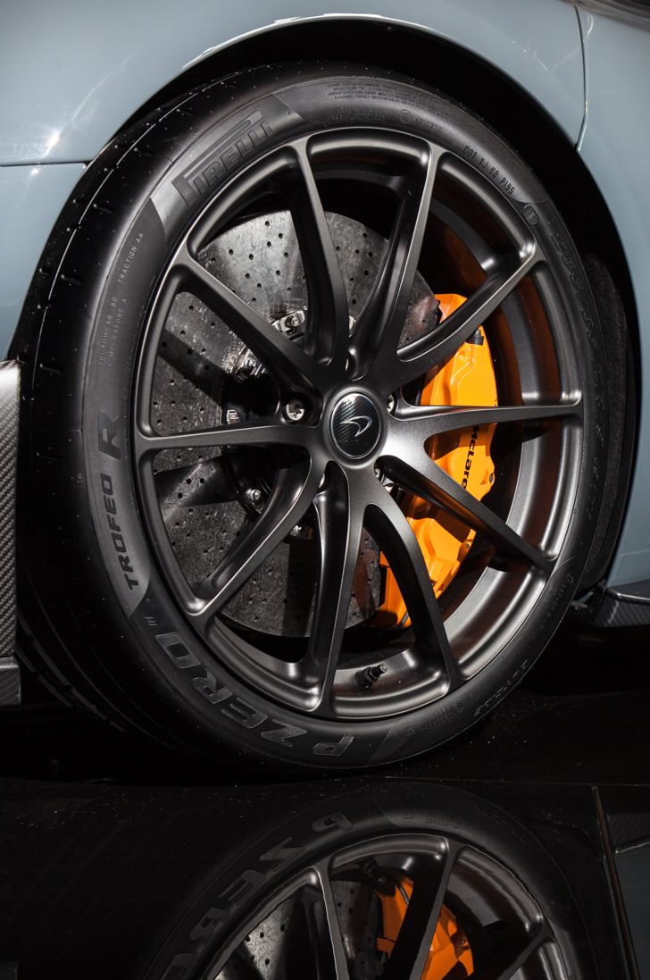 The aero balance is optimised by the active ‘Longtail’ Airbrake which, as with the McLaren F1 GTR ‘Longtail’, is larger – 50 percent larger than on other Super Series models. The reprofiled design flows into the lines of the new carbon fibre rear wings. Two circular exhaust pipes, forged from titanium, exit centrally through exposed bodywork below the rear wing. Despite a more complex design, the bespoke crossover system is designed to optimise performance and reduce weight, saving 1.1kg. The rear deck and sections flanking the exhaust pipes remain exposed; designed to evacuate hot air from the engine bay as efficiently as possible, while a lightweight polycarbonate rear screen features further louvres. A louvred carbon fibre rear bumper reduces air pressure over the rear wheels, while the rear design is completed with a dramatic integrated carbon fibre diffuser.