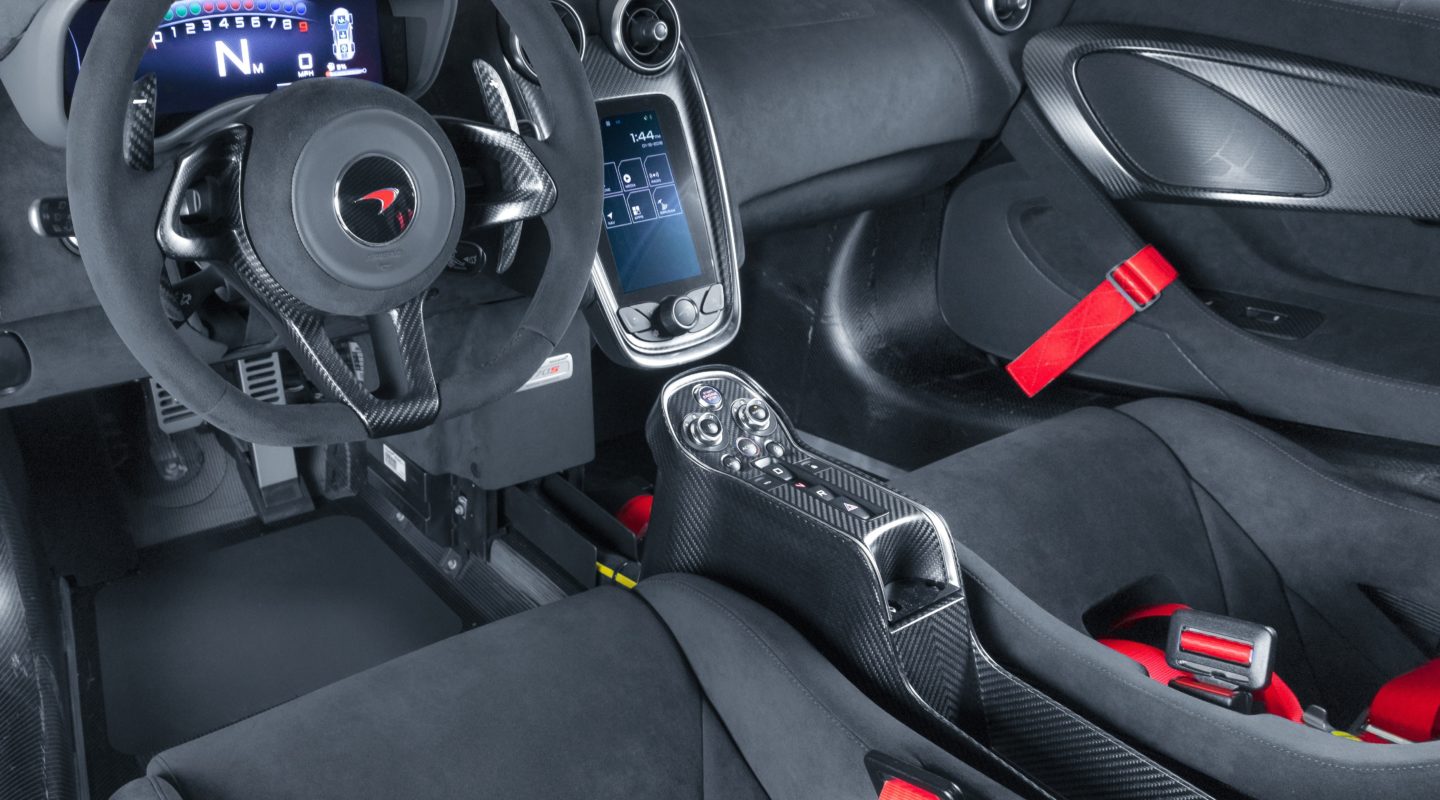 The interior of the car retains most creature comforts of the 570S road car but the bare carbon and alcantara along with seat harnesses create a race car like environment. The McLaren MSO X comes with normal seat belts as well in addition to parking sensors, front axle lift and air-conditioning.