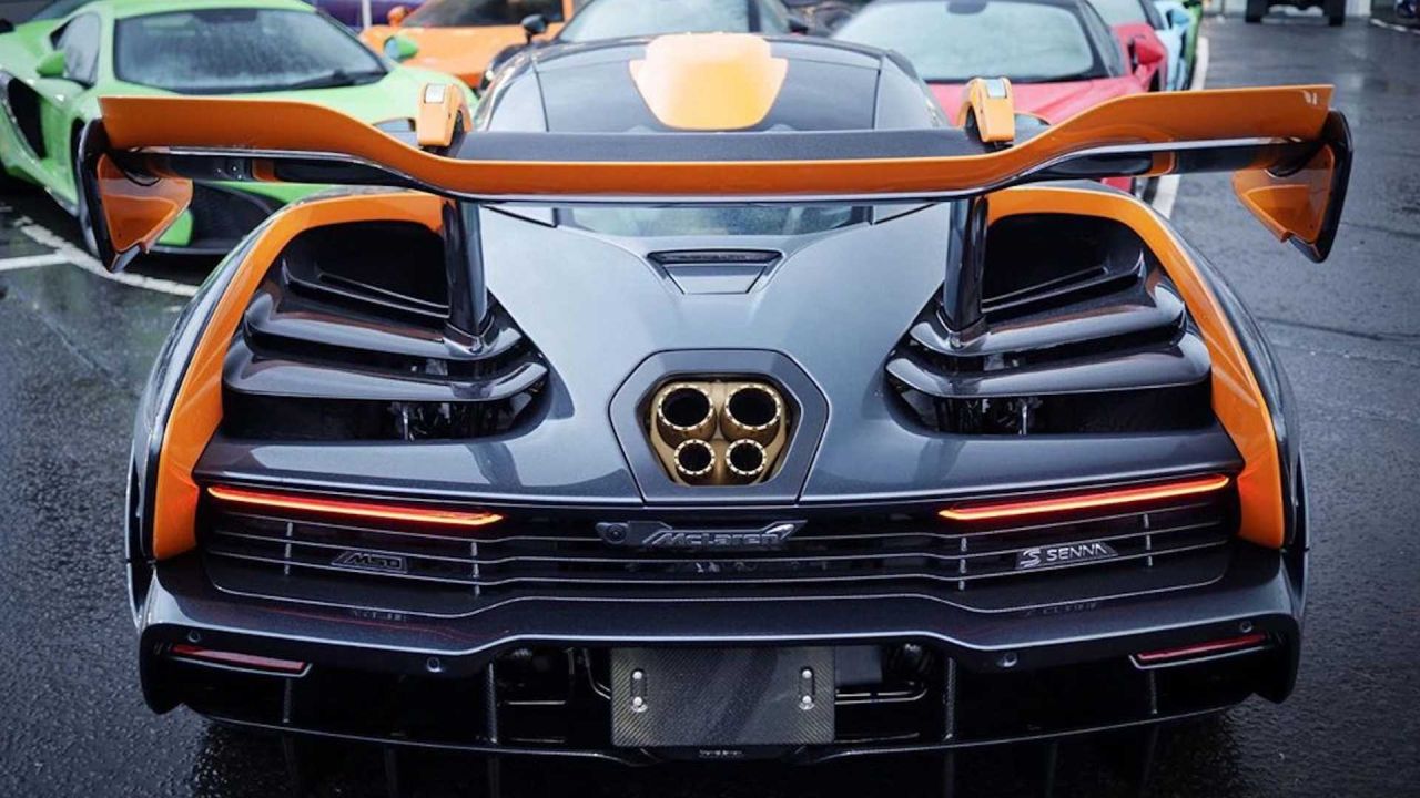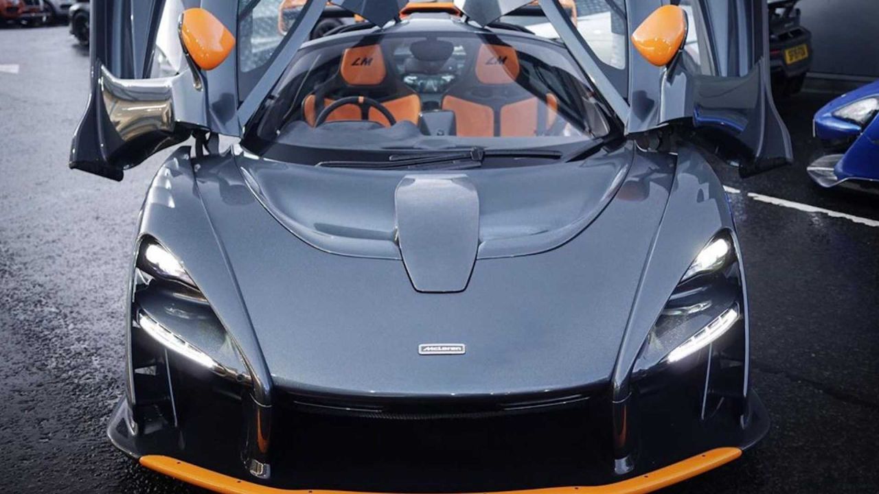 A grey McLaren Senna LM has arrived at a Glasgow dealership in the UK. The car is finished in a shade of grey and has orange highlights. The front splitter has orange on the front tip, while the mirorrs, rear spoiler and parts of the rear clam shell are also painted in orange.