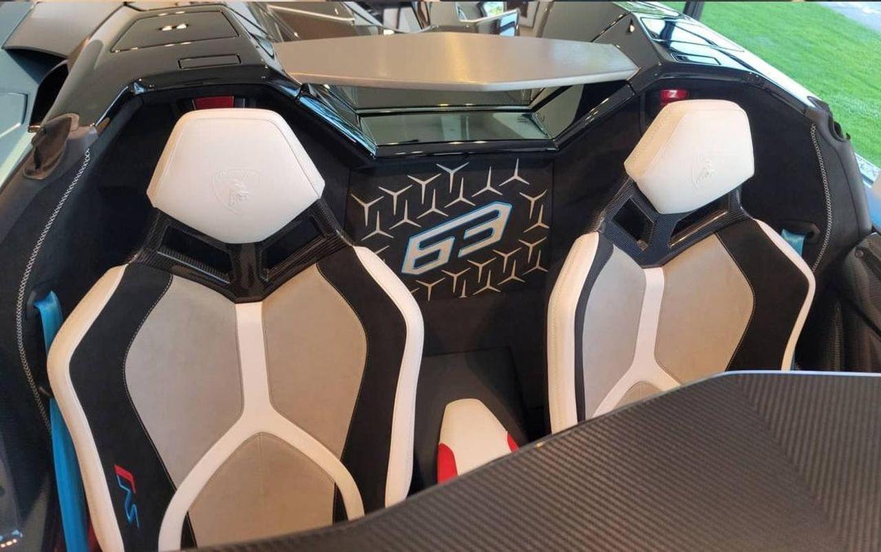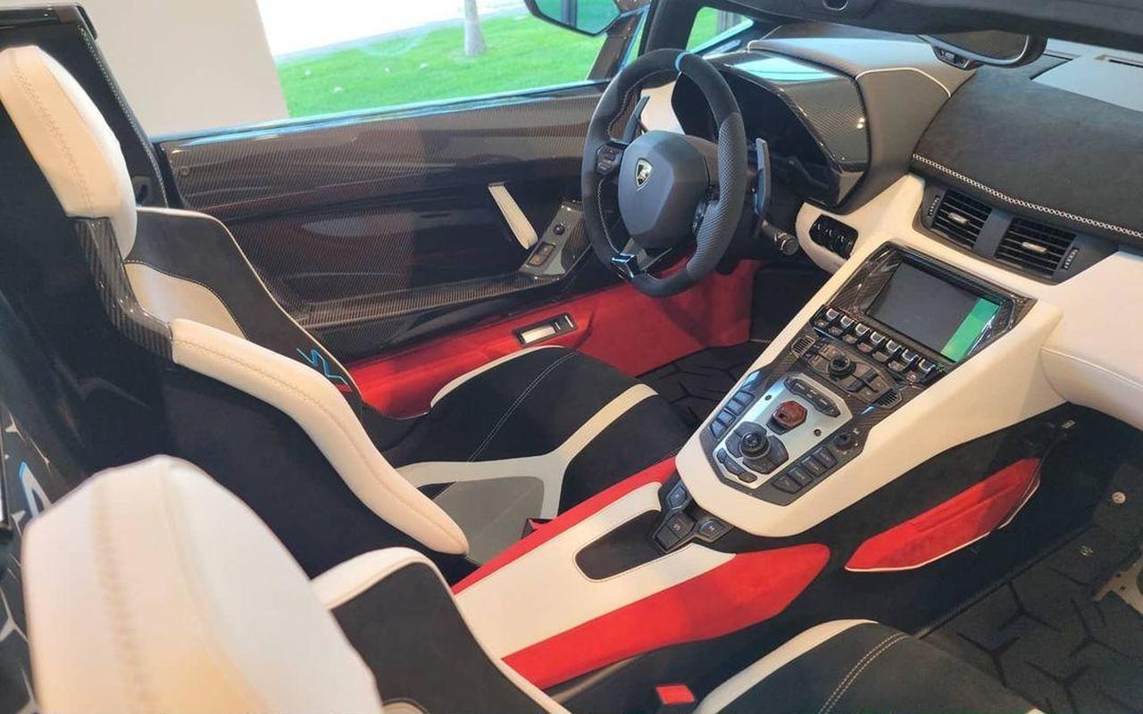 The interior is just as striking as the exterior. It features Nero Cosmus and Grigio Cronus leather upholstery with Bianco Leda inserts and matching stitching, piping and cross-stitching. The Alcantara steering wheel has perforated leather inserts, Blu Cepheus 12 o’clock mark and Bianco Leda stitching. This car is specced with carbon bucket seats with Blu Cepheus seat belts, Carbon Skin Package, engine start / stop button cover in real wood, etc. It also has special door sills with “omaggio alla Miura Roadster” lettering.