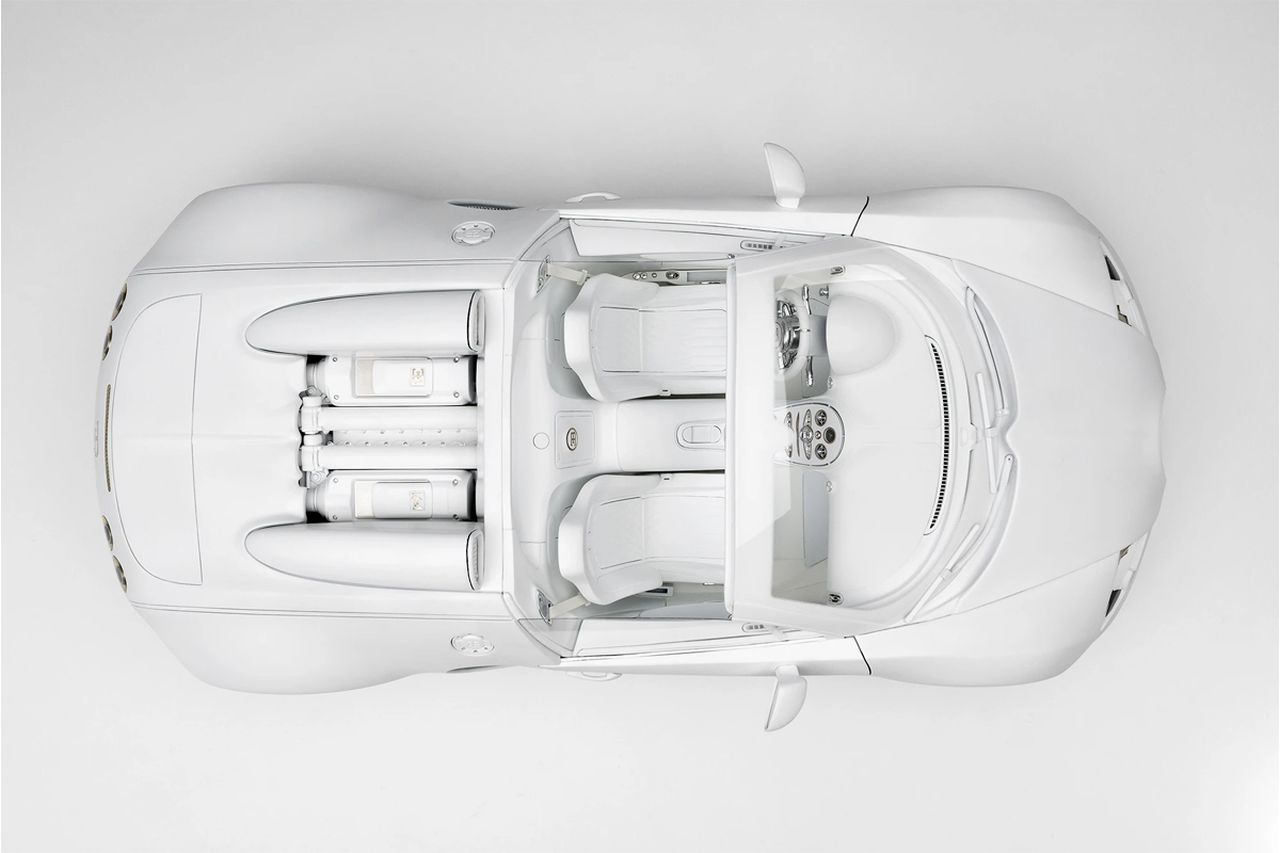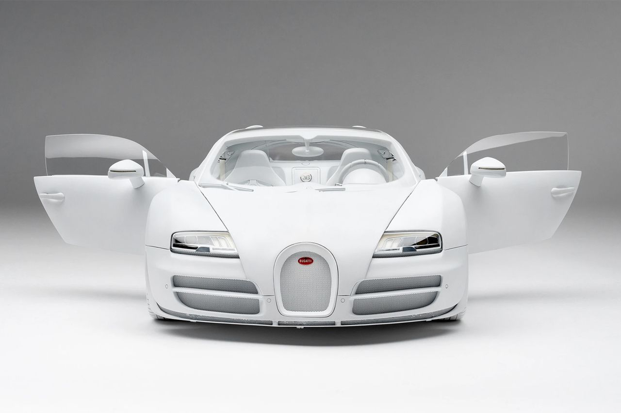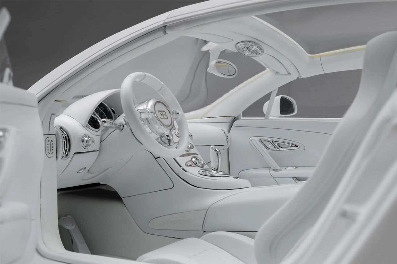 Almost all surfaces of the model are finished in white. Even the wheels, tires and brakes are painted in white and so is the interior. The color highlights the design details and lines of the Veyron – a car that was designed by Etienne Salome. The Bugatti logo, headlights, tail lights and the stop lamp are the only bits that finished in their original colors.