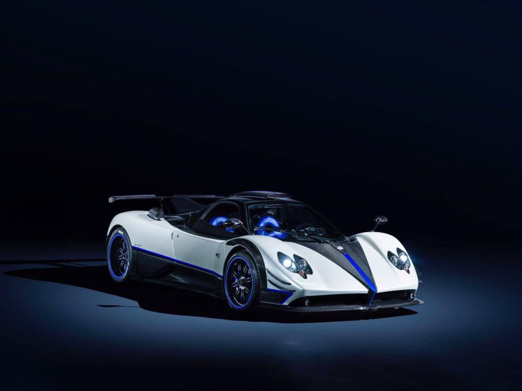 The Zonda Riviera features a similar paint scheme as the Koenigsegg Agera RS1 and the exterior is somewhat based on the Zonda Cinque. It is finished in pearl white with bare carbon fiber surfaces and blue accents. The front features twin carbon canards on either side and a carbon splitter. The front fender flares are also finished in carbon. The Zonda Riviera features a carbon roof scoop and a shark fin.