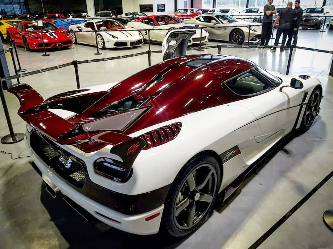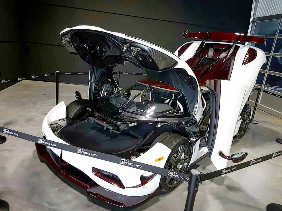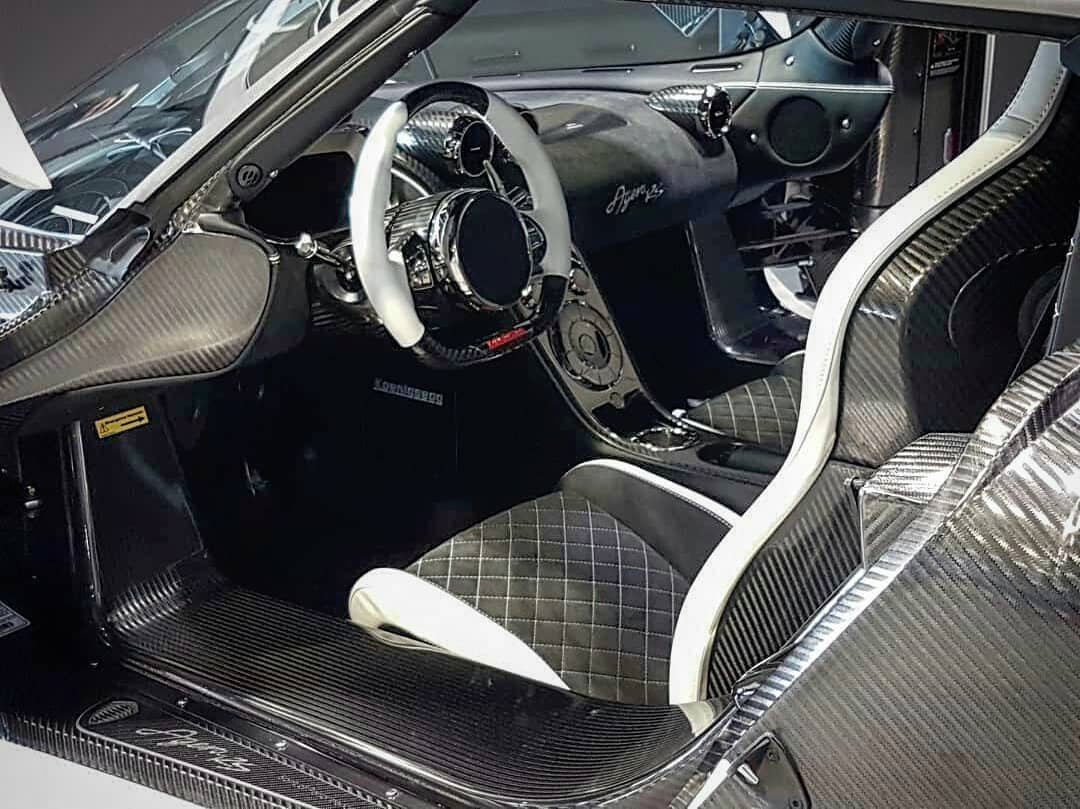 The car is finished in a unique Arctic Whites shade and is missing the bonnet stripes which have become very common on the Agera. Parts of the exterior including the front splitter, canards, side skirts, vents over both front and rear wheels, rear wing and most dominantly the roof are finished in a beautiful red carbon.