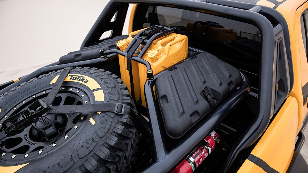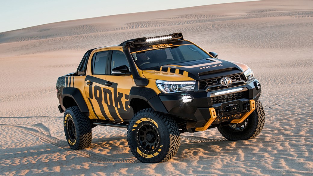 The Toyota Hilux Tonka Concept is based off a top-spec Hilux SR5 double-cab. It is powered by a 2.8-liter turbocharged diesel engine. It rides on 35-inch off-road tires and the bespoke suspension gives it a max ride height of 150 mm.